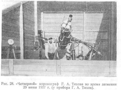 Интересные выводы получил известный пулковский астроном Г. А. Тихов в результате фотометрической обработки пластинок, снятых его «четверным» коронографом (рис. 2). Прибор представляет собой соединённые вместе четыре полутораметровые камеры. Употребляя соответствующие цветные фильтры и подходящие сорта фотографических пластинок, Г. А. Тихов смог получить фотографии короны в четырёх разных участках спектра— от фиолетового до красного, т. е. в четырёх цветах. С этим оригинальным инструментом Г. А. Тихов ездил в Швецию наблюдать затмение 29 июня 1927 г., наблюдал затмения 19 июня 1936 г. и 21 сентября 1941 г. Изучение корональных негативов позволило получить распределение цвета в короне. Оказалось, что внутренняя корона краснее Солнца, и температура её, следовательно, несколько ниже температуры поверхности Солнца. Это опровергает мнение о тождественности цвета короны и Солнца, укоренившееся после исследования немецкого астронома Гротриана.