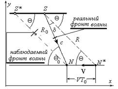 Пусть наблюдатель N движется относительно источника света S со скоростью V, как показано на рис. 1. Базовая система отсчета источника S (x0, y0, z0, t0). В момент излучения светового импульса источником S наблюдатель будет находиться в точке N*. В точке N световой импульс и наблюдатель встречаются. Из-за движения наблюдателя направление фронта световой волны этот наблюдатель будет воспринимать искаженным. Воспринимаемый наблюдателем фронт не будет перпендикулярен направлению SN. Наблюдаемый фронт будет перпендикулярен линии SN*. Видимое положение S* строится на продолжении лучей из точки N.
