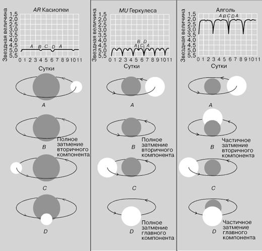 Переменные звезды. Видимый блеск звезды может изменяться по двум причинам: либо изменяется светимость звезды, либо что-то ее загораживает от наблюдателя, например, вторая звезда в двойной системе. Звезды с изменяющейся светимостью делятся на пульсирующие и эруптивные (т.е. взрывающиеся). Существует два важнейших типа пульсирующих переменных – лириды и цефеиды. Первые, переменные типа RR Лиры, имеют примерно одинаковую абсолютную звездную величину и периоды короче суток. У цефеид, переменных типа d Цефея, периоды изменения блеска тесно связаны с их средней светимостью. Оба типа пульсирующих переменных очень важны, поскольку знание их светимости позволяет определять расстояния. Американский астроном Х.Шепли использовал лириды для измерения расстояний в нашей Галактике, а его коллега Э.Хаббл использовал цефеиды для определения расстояния до галактики в Андромеде.