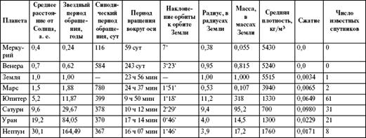 По физическим характеристикам большие планеты разделяются на две группы. Одну из них – планеты земной группы – составляют Земля и сходные с ней Меркурий, Венера и Марс. Во вторую входят планеты-гиганты: Юпитер, Сатурн, Уран и Нептун (табл. 1).