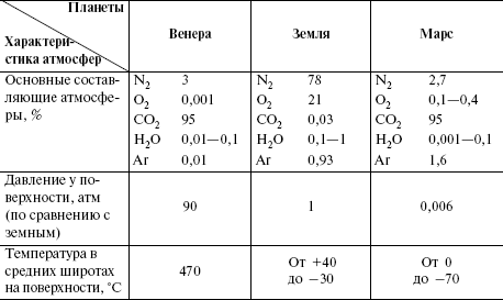 Предполагают, что атмосферы Марса и Венеры в основном сохранили тот первичный химический состав, который когда-то имела и атмосфера Земли. За миллионы лет в земной атмосфере в значительной степени уменьшилось содержание углекислого газа и увеличилось – кислорода. Это объясняется растворением углекислого газа в земных водоемах, которые, видимо, никогда не замерзали, а также выделением кислорода появившейся на Земле растительностью. Ни на Венере, ни на Марсе такие процессы не происходили. Более того, современные исследования особенностей обмена углекислым газом между атмосферой и сушей (при участии гидросферы) способны объяснить, почему Венера лишилась своей воды, Марс замерз, а Земля осталась пригодной для развития жизни. Так что существование жизни на нашей планете объясняется, вероятно, не только ее расположением на благоприятном расстоянии от Солнца.
