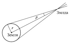 Годичным параллаксом (р) принято называть угол, под которым со звезды виден радиус (r) земной орбиты, перпендикулярный лучу зрения (рис. 5). Этот угол столь мал (менее 1 '), что ни Аристотелю, ни Копернику его обнаружить и измерить не удалось, поскольку они вели наблюдения без оптических приборов.