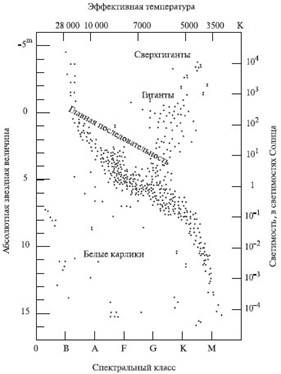 Если расположить звезды на диаграмме в соответствии с их светимостью и температурой, то окажется, что по этим характеристикам можно выделить несколько типов (последовательностей) звезд (рис. 6): сверхгиганты, гиганты, главная последовательность, белые карлики и т. д. Наше Солнце вместе со многими другими звездами относится к числу звезд главной последовательности.