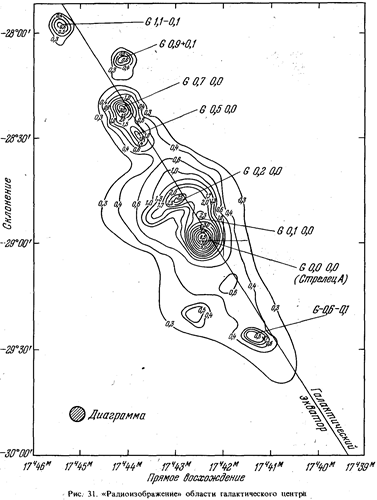 В центре туманности Андромеды в оптических лучах наблюдается компактный объект с угловыми размерами 1" x 1,5". Его видимая звездная величина около 12 m. Так как расстояние до этой гигантской звездной системы около 700000 пк, то линейные размеры ее ядра 3 x 5 пк, а светимость соответствует нескольким десяткам миллионов Солнц. Заметим, что оптические наблюдения ядра туманности Андромеды возможны потому, что ее экваториальная плоскость наклонена к лучу зрения под большим углом, так что протяженность поглощающего свет слоя межзвездной пыли сравнительно невелика. Между тем из-за того, что Солнце находится очень близко от галактической плоскости, к которой концентрируется межзвездная пыль, излучение от центра нашей Галактики проходит через огромную толщу поглощающего свет вещества.