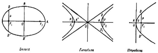 Размер орбиты и ее форму характеризуют элементы p и e - параметр и эксцетреситет (рис. 2). Эксцетреситетом орбиты e наз. отношение расстояния между фокусами F1F2=2c этой орбиты к расстоянию между ее вершинами A и A'. Расстояние между ее вершинами обозначают 2a, а величину a наз. большой полуосью орбиты, так что e=c/a. Для нашей параболической орбиты c=a, поэтому e=1. Половина фокальной хорды DD' орбиты, перпендикулярной к ее оси, носит название фокального параметра и обозначается буквой p. Вместо двух элементов p и e для параболы используют один элемент q=p/2 - перигелийное расстояние (на рис. 2 отрезок AF1). Движение по круговой орбите является частным случаем движения по эллипсу (e=0).