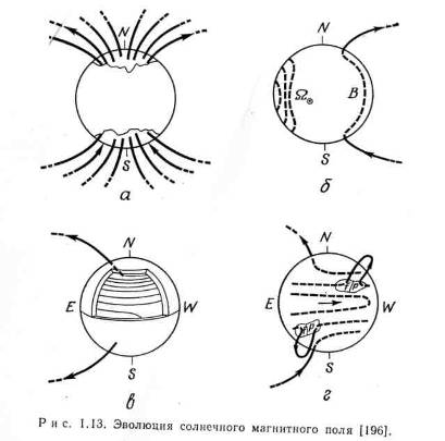 Причиной нестабильности активности Солнца является его дифференциальное вращение, которое «вытягивает» погружённые силовые линии магнитного поля Солнца и усиливает его до 2000-4000Гс. Это усиление делает погружённые силовые трубки неустойчивыми, обуславливая их появление над поверхностью фотосферы на гелиографических широтах ±40° и постепенное снижение к экватору. В точках пересечения образуются пятна(первым- ведущее пятно), в областях над ними разогревается хромосфера и корона- образование факелов (флоккул)и протуберанцев (волокон).