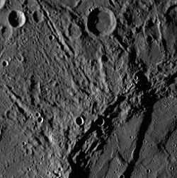 Поверхность Меркурия во многом напоминает лунную — она усеяна множеством кратеров. Плотность кратеров различна на разных участках. Предполагается, что более густо усеянные кратерами участки являются более древними, а менее густо усеянные — более молодыми, образовавшимися при затоплении лавой старой поверхности. В то же время, крупные кратеры встречаются на Меркурии реже, чем на Луне. Самый большой кратер на Меркурии назван в честь великого немецкого композитора Бетховена, его поперечник составляет 625 км. Однако сходство неполное — на Меркурии видны образования, которые на Луне не встречаются. Важным различием гористых ландшафтов Меркурия и Луны является присутствие на Меркурии многочисленных зубчатых откосов, простирающихся на сотни километров — эскарпов. Изучение их структуры показало, что они образовались при сжатии, сопровождавшем остывание планеты, в результате которого поверхность Меркурия уменьшилась на 1 %. Наличие на поверхности Меркурия хорошо сохранившихся больших кратеров говорит о том, что в течение последних 3—4 миллиардов лет там не происходило в широких масштабах движение участков коры, а также отсутствовала эрозия поверхности, последнее почти полностью исключает возможность существования в истории Меркурия сколько-нибудь существенной атмосферы.
