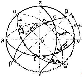 Вертикальная линия Zn, проходящая через центр сферы (точка 0), называется отвесной линией. Её пересечение с поверхностью сферы даёт точки зенита Z и надира n. Плоскость, проходящая через центр небесной сферы перпендикулярно отвесной линии, называется плоскостью истинного горизонта, а линия пересечения этой плоскости с поверхностью сферы называется истинным горизонтом. Линия, проходящая через центр небесной сферы параллельно земной оси РmPs, называется осью мира РР¢. Плоскость, проходящая через центр небесной сферы параллельно плоскости земного экватора, называется плоскостью небесного экватора