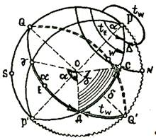 е) перпендикулярно оси мира через центр сферы проводится плоскость небесного экватора. Точки пересечения неб экв с истинным горизонтом обозначают E и W (если смотреть на север, то Е - справа, W - слева). 2. Нанесение видимого места светила на небесную сферу: