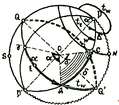 а) по известному часовому углу светила (или азимуту, если координата светила задана в горизонтной системе координат) находится точка на небесном экваторе (истинном горизонте), через которую проводится меридиан (вертикал) светила;