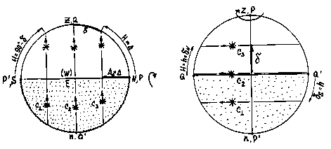 т.е. на полюсе (рис. 1.10) горизонт не вращается, а плоскость меридиана вращается с угловой скоростью вращения Земли. Это значит, что на полюсе высоты светил не изменяются, а азимуты изменяются c максимальной скоростью 15 градусов в час.