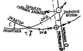 Чтобы получить постоянную единицу солнечного времени, на небесном экваторе выбрали условную точку - среднее экваториальное Солнце (Рис. 2.4), которое в течение года равномерно движется по экватору в ту же сторону, что и истинное Солнце.