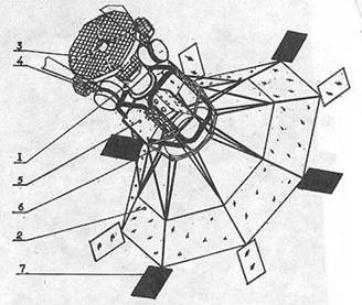 (рис. 2) Общий вид МКЛ в проекте «Регата-Плазма» (РП). Основная особенность этого типа МКЛ — наличие вращающейся платформы (1) и паруса (2) из отражающего «зеркального» материала. Продольная ось МКЛ направлена на Солнце солнечной панелью (3), являющейся основным источником питания. Вращающаяся платформа (15 об/мин) имеет свои солнечные панели (4). Научная и служебная аппаратура располагается на термостатированной раме (5), на которой укреплено жидкостное демпфирующее устройство (6), гасящее поперечные колебания МКЛ. Для компенсации ошибок наведения, а также для программных разворотов и вращения вокруг продольной оси МКЛ используются управляемые солнечные паруса (7), имеющие двухстороннее покрытие: «зеркальное» и «черное» (поглощающее).