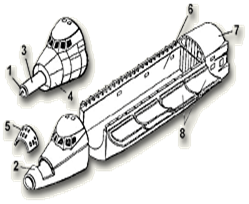 Боевой ударный модуль космического базирования: 1 - стыковочный узел; 2 - носовая часть фюзеляжа (НЧФ); 3 - переходный отсек; 4 - герметичный модуль кабины; 5 - носовой блок двигателей управления; 6 - средняя часть фюзеляжа (СЧФ); 7 - хвостовая часть фюзеляжа (ХЧФ); 8 - створки отсека полезного груза с панелями радиационного теплообменника