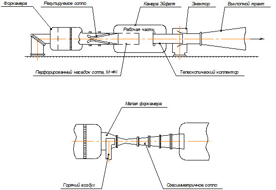 Рабочая камера представляет собой камеру Эйфеля телескопического типа с оптическим отсеком для наблюдения за потоком. Такая конструкция камеры позволяет обеспечить установку и проведение испытаний крупногабаритных моделей.