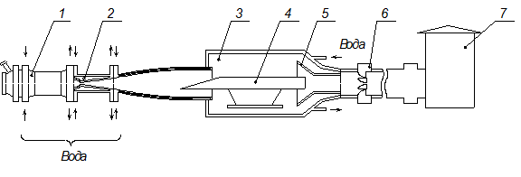 Диффузор стенда работает по схеме разделения потоков на внешний, обтекающий модель ГПВРД и внутренний, проходящий через модель. Оба потока тормозятся в отдельных каналах. Диффузор, тормозящий внешний поток, представляет собой сначала сужающийся, а затем постоянного сечения кольцевой канал с площадью сечения 0,16м2 и длиной 4м. внутренний диффузор представляет собой цилиндрический канал с постоянной площадью сечения 0.035м2 и длиной 3м, который непосредственно примыкает к выходу модели ГПВРД.