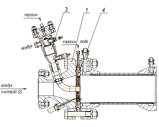 Воздух, через трубопровод высокого давления, обогащаясь в смесителе газообразным кислородом, поступает через отверстия в топливном коллекторе в камеру сгорания. Через форсунки топливного коллектора в камеру сгорания подается керосин, который смешивается с воздухом. Образующаяся керосин - кислород - воздушная горючая смесь поджигается от факела пламени из пускового блока и сгорает в камере сгорания.