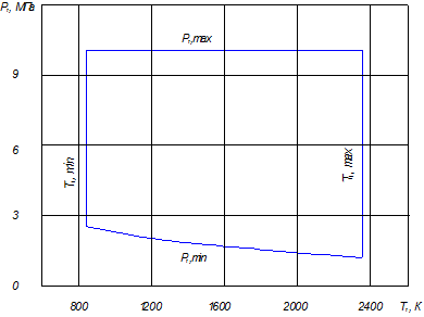 Область работы воздухоподогревателя представлена на рис. 6. Верхняя граница области работы по давлению Pt и температуре Тt газа в воздухоподогревателе в настоящее время ограничена максимальным располагаемым давлением в топливной системе Рт=10 МПа. Нижняя граница определяется минимально возможным перепадом давления на топливных форсунках Рт=0.2 МПа, при котором сохраняется устойчивая работа воздухоподогревателя. Правая граница -Тt=2350 К - определяется предельным расходом кислорода 1.5 кг/с, а левая Tt=850 К - пределами воспламенения и стабилизации горения керосина в воздухоподогревателе.