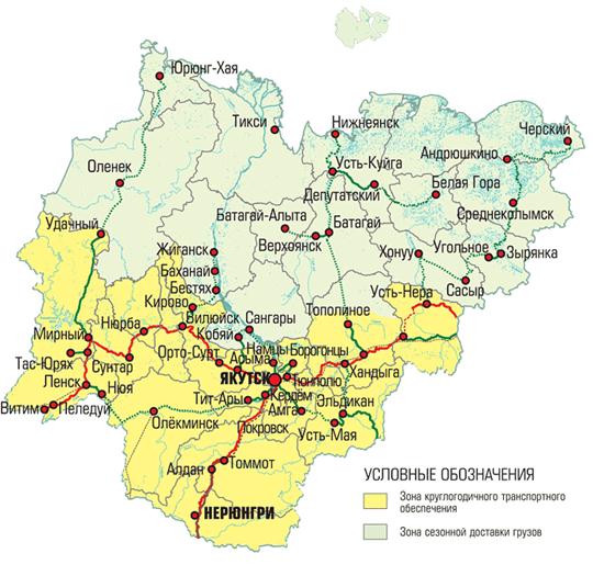 В Республике Саха (Якутия) в зоне круглогодичного наземного транспортного сообщения проживает всего 15% населения. Более 90% территории, где производится 88% всей продукции, имеет лишь сезонную транспортную доступность. Для большинства населенных пунктов республики авиация – единственный вид транспорта круглогодичного действия, из 552 сельских населенных пунктов только 208 [73]связаны с районными центрами автомобильными дорогами с твердым покрытием.(Рис1)