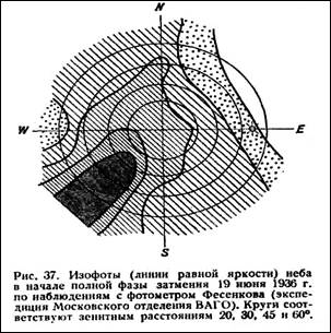 Как показали фотометрические наблюдения во время солнечных затмений 1936, 1941, 1945 и 1952 гг., распределение яркости по небу за время полной фазы значительно изменяется, отражая перемещение лунной тени относительно наблюдателя. Для примера приводим рис. 2 и 3, на которых изображены изофоты (линии равной яркости) неба в начале и в конце полного затмения 19 июня 1936 г. по данным экспедиции Московского отделения ВАГО. Лунная тень перемещалась тогда с юго-запада на северо-восток.