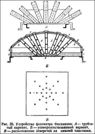 От этого недостатка свободен усовершенствованный фотометр Фесенкова (рис. 4, Б), который состоит из полой металлической полусферы, точнее, сферического сегмента а, укреплённого на металлическом кольце b, которое установлено на эбонитовый круг с. Трубки d расположены между сферическим сегментом а и эбонитовым кругом с (что обеспечивает прочность прибора и предохраняет от случайных поломок).