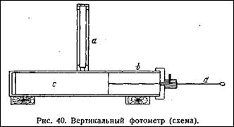 Изучить распределение яркости по вертикалу Солнца можно и с помощью специального фотометра (рис. 5), который мы назовём «вертикальным» (конструкция М. М. Дагаева). В нём трубки (такие же, как и в фотометре Фесенкова) располагаются «веером» в одной плоскости и для удобства заключены в кольцевой полуцилиндр а. Внутренние концы трубок прилегают к отверстиям в цилиндре b, в котором движется цилиндрическая кассета с с плёнкой 13 х 18 см, свёрнутой в рулон слоем наружу. Перемещение кассеты с плёнкой осуществляется с помощью ручки d.