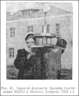 Фотометр укладывается горизонтально на деревянные подставки и укрепляется на доске, причём его установка выверяется по отвесу и уровню. Кольцевой полуцилиндр и оси трубок располагаются в одном вертикале. Необ ходимо, конечно, заранее рассчитать азимут Солнца для середины полной фазы затмения, и в этом вертикале установить фотометр. Поскольку полная фаза затмения весьма непродолжительна (2—3 минуты), то не имеет смысла поворачивать фотометр по азимуту за Солнцем, так как за время продолжительности полной фазы суточное смещение Солнца не превосходит 0°,5, что лежит в пределах диаметра площадки неба, охватываемой каждой трубкой. За время полной фазы с этим фотометром можно сделать 10—12 экспозиций (по 5 сек. каждая). Фотометрию в вертикале Солнца тоже весьма желательно провести с различными фильтрами, для чего нужно иметь несколько вертикальных фотометров. Экспозиции для каждого фильтра нужно подбирать отдельно, как рассказано выше. Зарядка этого фотометра производится в полной темноте, совершенно так же, как и зарядка заревого фотометра.