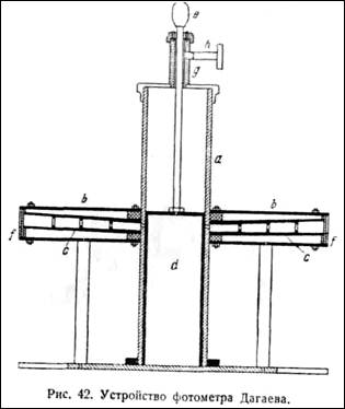 Гораздо лучше применить для этой работы специальный заревой фотометр, разработанный М. М. Дагаевым (рис. 6). Фотометр представляет собой цилиндр а высотой около 30 см и диаметром 6 см (рис. 7). Посередине к нему приделана охватывающая его цилиндрическая насадка b высотой 3 см и диаметром 26 см, внутри которой укреплены 8 (или 12) одинаковых трубок с, расположенных радиально через 45° (или 30°), но не в одной плоскости, а под углом 5—10° к горизонту.