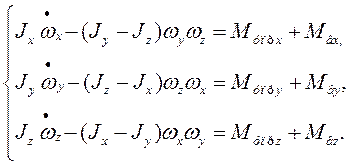 Если триэдр жестко связанных с телом осей Oxyz, с началом координат в центре масс КА (связанная система координат - ССК) направить так, чтобы они совпали с главными центральными осями инерции, то центробежные моменты инерции обратятся в нуль и система уравнений Эйлера [1, 2], описывающая динамику вращения КА вокруг центра масс, примет вид (1.1):