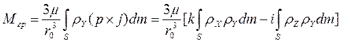 Найдем выражения, позволяющие вычислять составляющие вектора гравитационного момента Мгр, действующего на некоторое тело S [1, 3]. Введем связанную с телом правую систему координат ОXоYоZo с ортами i, j, k и началом в центре масс тела О, которая совпадает с орбитальной. Соответственно ось OYo натравим по продолжению радиуса-вектора, соединяющего центр притяжения С с началом О, а ось ОXo расположим в мгновенной орбитальной плоскости. Гравитационный момент, действующий на тело S, будет равен:
