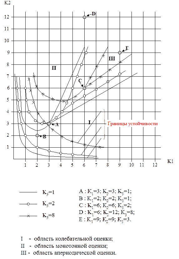 На плоскости К1К2 для фиксированного К3 построим области различного расположения корней внутри каждой части области устойчивости (см. рис. 2.1).