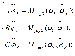 Важным свойством динамической системы ориентации является: если осями ориентации являются поступательно движущиеся оси, то при соответствующем законе управления вместо сложных пространственных поворотов космического аппарата можно изучать три независимых плоских угловых движения, что мы и сделаем в системе, т.е.: