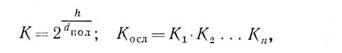 где К — коэффициент ослабления одного защитного слоя преграды (материала); Косл — общий коэффициент защиты преграды, состоящей из n-го количества слоев различных материалов; h — толщина (высота) слоя материала, см; dпол — толщина слоя материала, ослабляющего излучение в два раза.