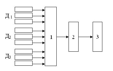 Типичная схема бесплатформенной системы управления космическим аппаратом показана на (рис 2.1). С бортовой цифровой вычислительной машиной 1 соединены три группы датчиков, условно обозначенных через Д1,