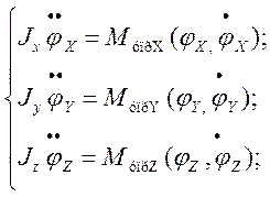 Важным свойством динамической системы ориентации является: если осями ориентации являются поступательно движущиеся оси, то при соответствующем законе управления вместо сложных пространственных поворотов космического аппарата можно изучать три независимых плоских угловых движения, что мы и сделаем в системе, т.е.: