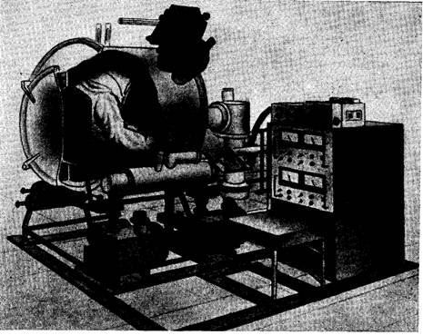 Такие обнадеживающие результаты позволили сделать попытку выполнить вручную и электронно-лучевую сварку — процесс, отличающийся очень высокой концентрацией тепловой энергии в пятне нагрева. Для этой цели разработана специальная ручная электронная пушка (рис. 4), которая позволила с использованием стенда 06-1469 успешно провести ряд экспериментов по ручной электронно-лучевой сварке. Эксперименты показали, что этот способ имеет большие потенциальные возможности для применения его в космических условиях.