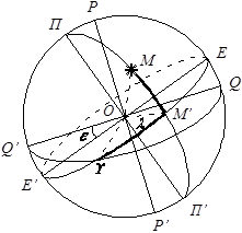 Эклиптическая система координат. Эклиптическая система координат (рис. 7) может быть получена из экваториальной системы путём мысленного его поворота вокруг центра небесной сферы на угол 23°26’ (угол наклона оси вращения Земли к плоскости эклиптики (плоскости земной орбиты)). При этом аналогом оси мира становится ось эклиптики, а аналогом плоскости небесного экватора - плоскость эклиптики. Точки