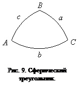 Сферическим треугольником называется фигура на поверхности сферы, образованная пересечением трёх дуг больших кругов этой сферы (рис. 9). Вершины сферического треугольника принято обозначать большими буквами латинского алфавита, а противолежащие этим сторонам угла – соответственно малыми буквами.