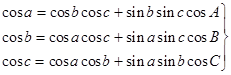 Косинус одной стороны сферического треугольника равен сумме произведения косинусов двух других его сторон и произведения синусов тех же сторон на косину угла между ними: