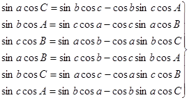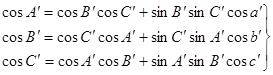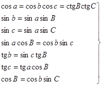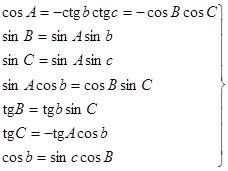 На основе этих свойств полярного треугольника и исходя из (8) – (12), можно получить другие зависимости между сторонами и углами сферического треугольника. Так, например: