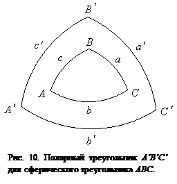 Полярным треугольником для данного сферического треугольника называется такой сферический треугольник, по отношению сторон которого вершины данного являются полюсами, то есть отстоят от сторон на 90° (рис. 10).