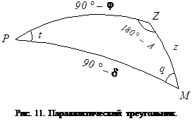 В основе преобразований экваториальных координат в горизонтальные лежит сферический треугольник PZM (рис. 11), который называется параллактическим. Вершинами его являются зенит Z, полюс мира P и светило М. Сторона ZP представляет собой дугу небесного меридиана, сторона ZM – дугу вертикального круга, а сторона PM – дугу часового круга. Угол q треугольника называется параллактическим углом.