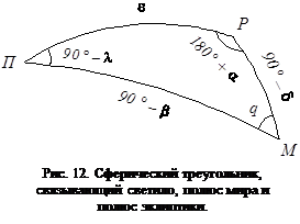 В основе преобразований лежит сферический треугольник РМП (рис. 12). Его вершинами являются: полюс мира Р, полюс эклиптики П и светило М. Сторона ПР равна углу наклона эклиптики к экватору