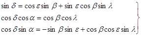 Переход от эклиптических координат к экваториальным.