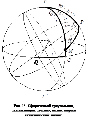 В основе преобразований лежит сферический треугольник РГМ (рис. 13), вершинами которого являются: северный полюс мира Р, северный галактический полюс Г и светило М. Сторона РМ равна