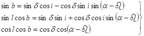 В этих формулах положение галактического экватора задано прямым восхождением А и склонением D его северного полюса Г. Очень часто положение галактического экватора задаётся прямым восхождением b его восходящего узла и углом наклонения i галактического экватора к небесному экватору. Эти четыре величины связаны между собой соотношениями:
