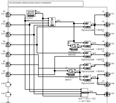 Линия запускается по сигналу от элемента TIMESW. В случае срабатывания датчиков (b1, b2, b3) на выходе логического элемента AND формируется логическая единица, которая поступает на вход SET элемента SET/RESET. В результате на выходах O 01…O 03 формируется логическая единица. Как только заполниться смеситель срабатывает датчик b5 и логическая единица со входа O 04 поступает на вход RESET элемента SET/RESET. В результате на выходах O 01…O 03 формируется логический ноль.