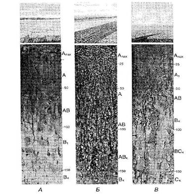 Рис.1. Черноземы: А – выщелоченный, Б – типичный, В – оподзоленный