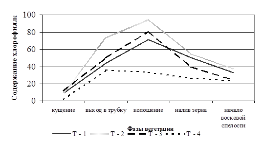 Установлено, что синтез простейших первичных продуктов фотосинтеза приводит к образованию углеводов и белков, следовательно, то или иное количество хлорофилла, динамика его накопления может оказывать влияние на формирование урожая. Поэтому в своей работе мы проводили определение накопления хлорофилла в растениях озимой пшеницы по фазам вегетации при рекомендуемой в нашей зоне норме высева и различных технологиях возделывания.