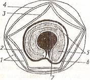 1 – покрытие из дражировочного состава; 2 – околошюдник; 3 – слой фунгицидов; 4 – слой инсектицидов; 5 – зародыш; 6 – семенная оболочка; 7 – перисперм.